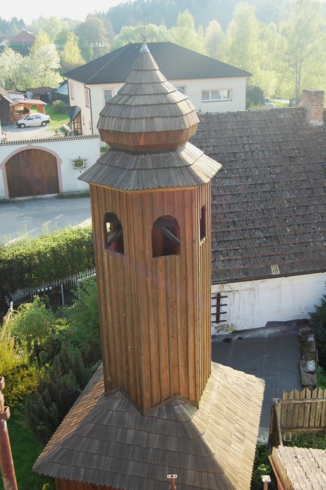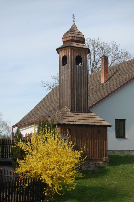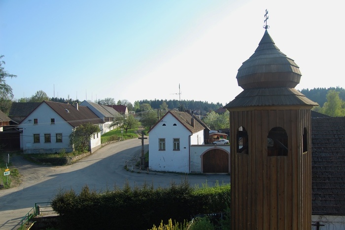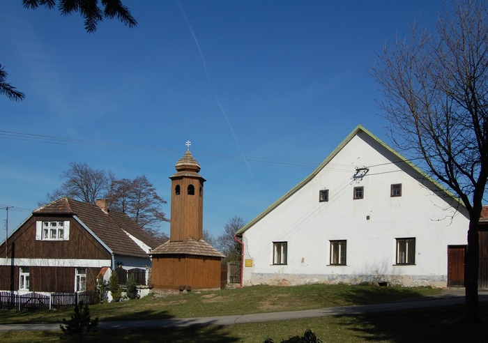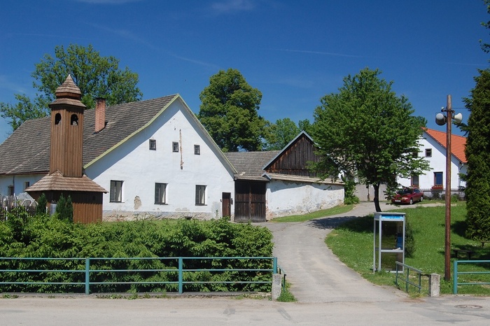 Náves - č. p. 36 s nově obloženým štítem v r. 2012 a č. p. 13