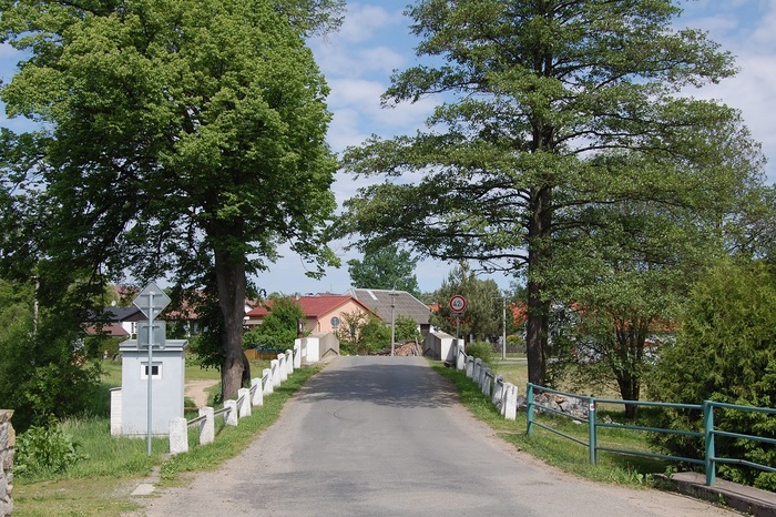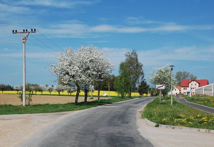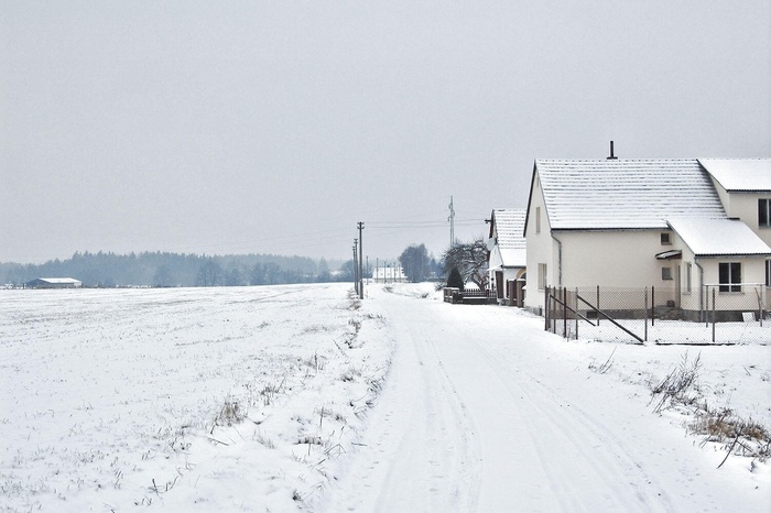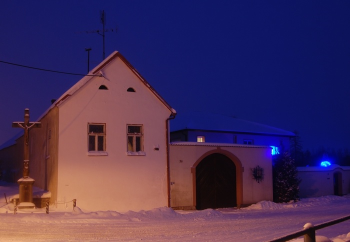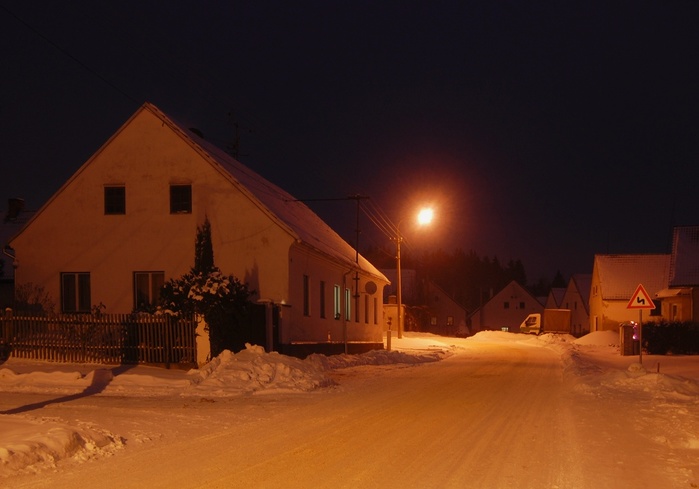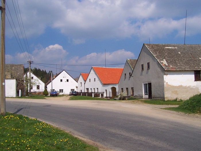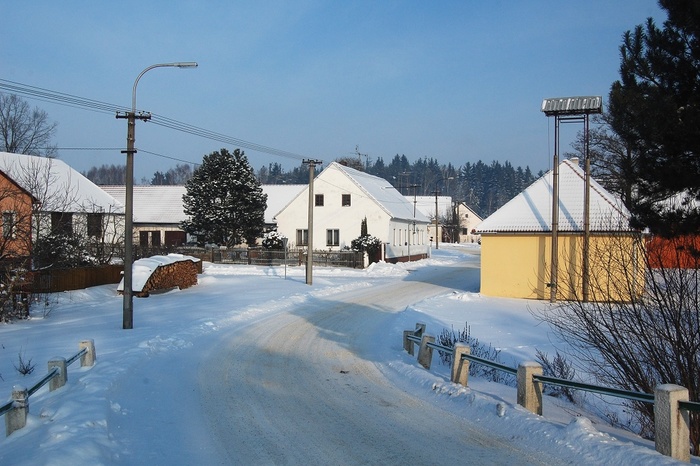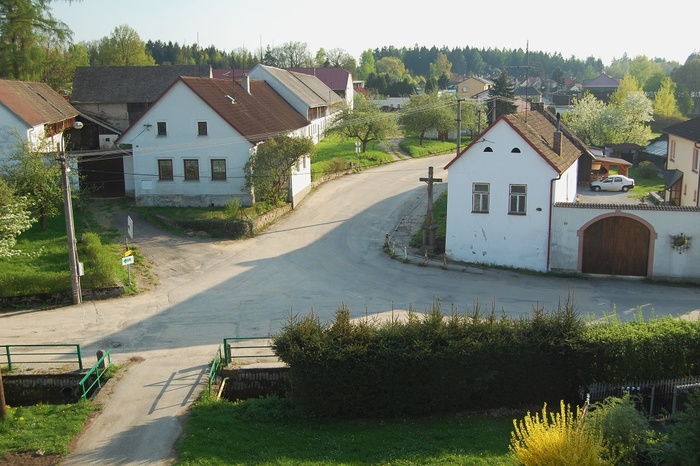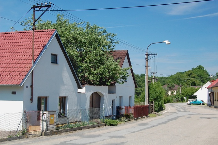 Náves - zatáčka ke kulturáku mezi č. p. 21 a 28, kde dříve stával ještě jeden dům