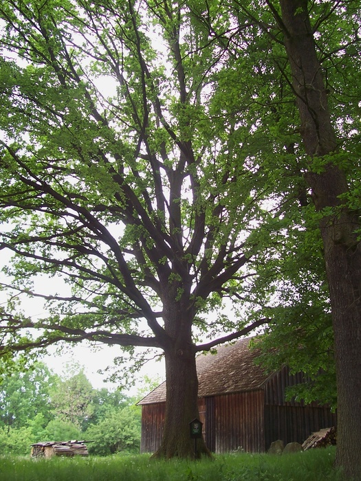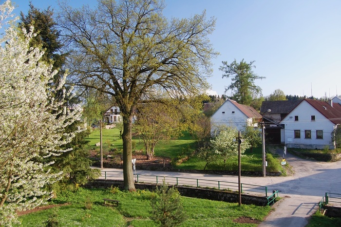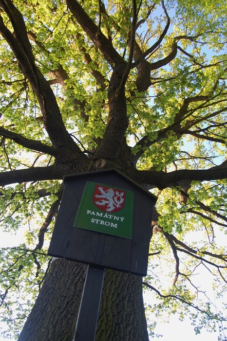 Koruna více než 700 let starého památkově chráněného dubu za penzionem č. p. 12