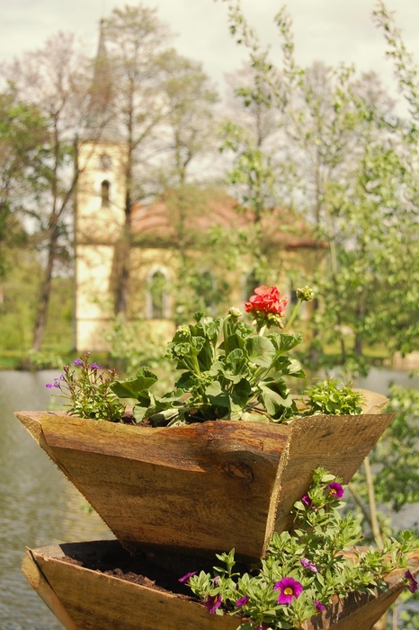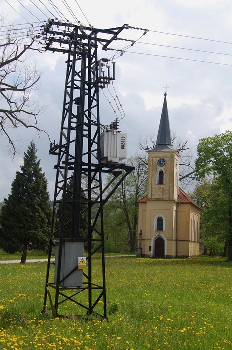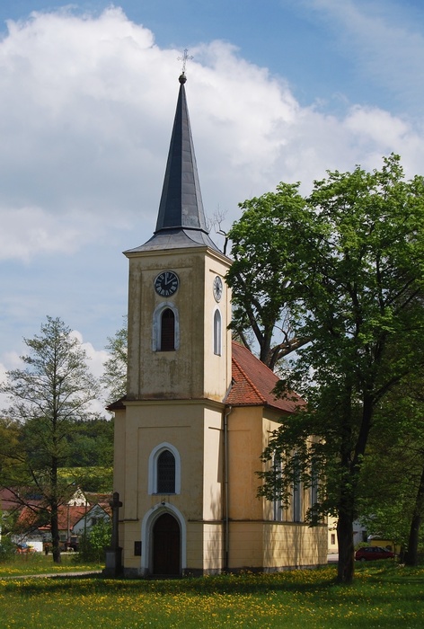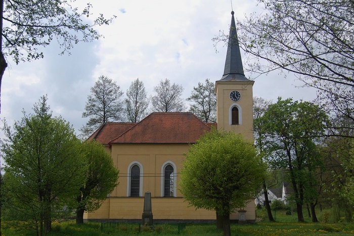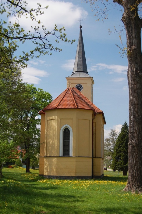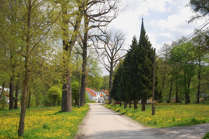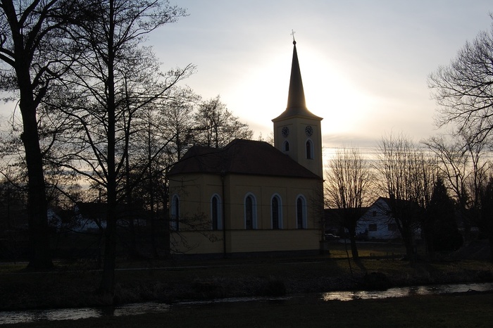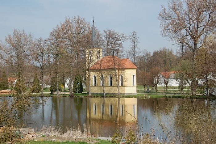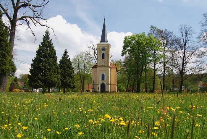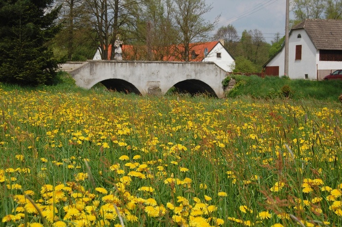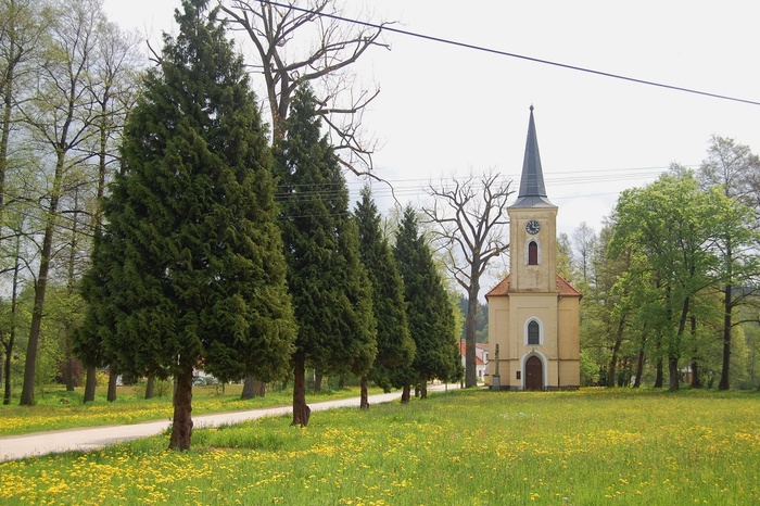 Kaple v jarní záplavě trávy a pampelišek