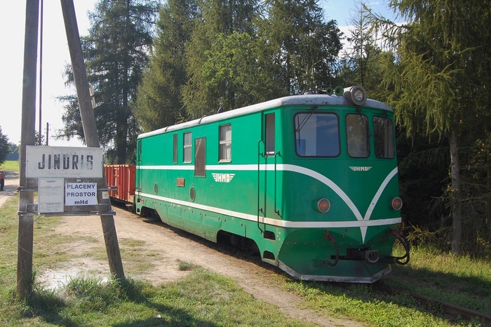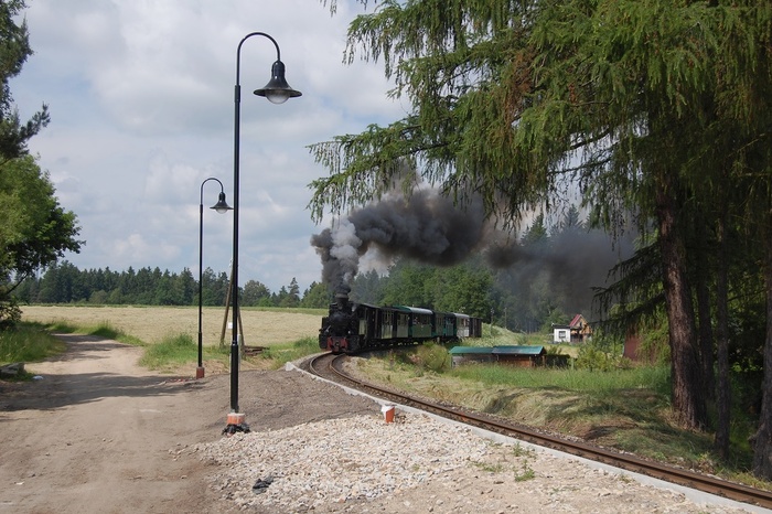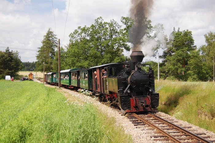 Tzv. "loďovlak" převážející lodičky s vodáky z Jindřiše do Malého Ratmírova u jindřišské zastávky v podání lokomotivy T47.021