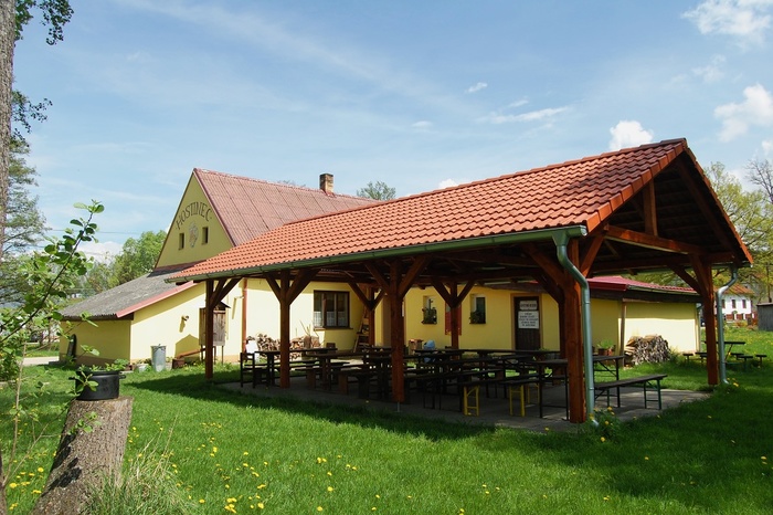 Venkovní posezení pod pergolou mezi hospodou a návesním rybníkem