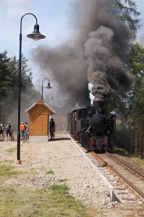 Lokomotiva U46.001 Rešica vjíždí do nově zrekonstruované zastávky (6/2013)